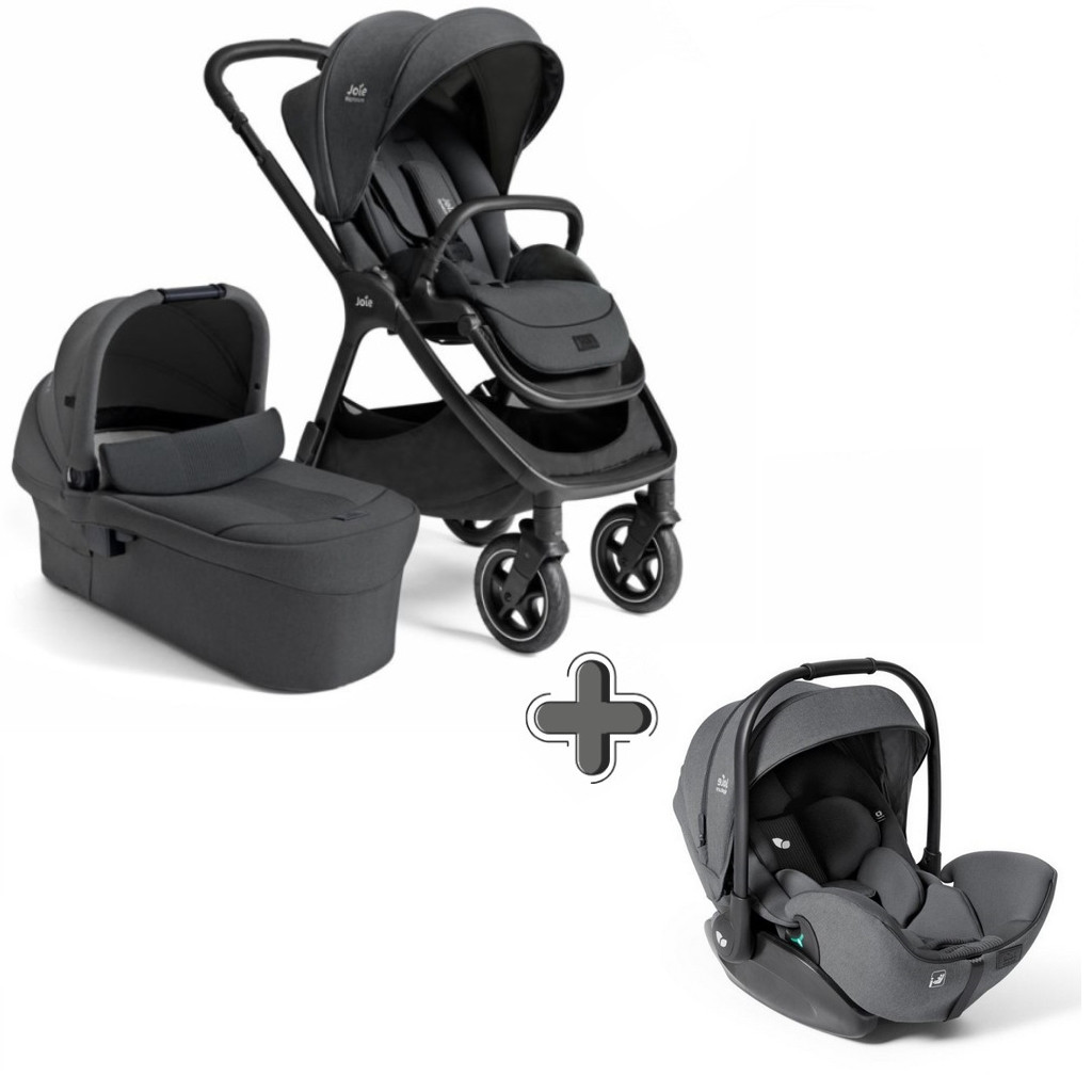 A szett a Joie Signature Finiti 2in1 babakocsiból és a Joie Signature i-Level Pro hordozóból áll.