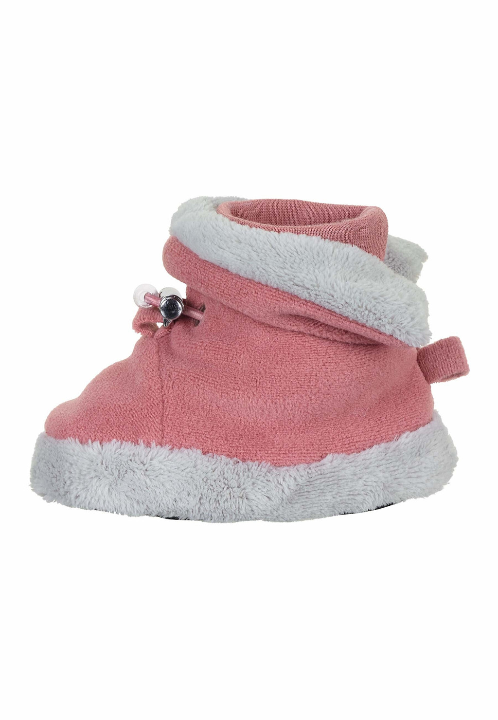 A babacipő mikropolár anyagból készült és kellemes pamut polárral bélelték. Az elasztikus anyagból készült pamut bújós mandzsetta és a zsinórdugó jó tartást és illeszkedést biztosít a kis lábaknak. A csúszásmentes talpnak köszönhetően babája megteheti az első lépéseit melletted.