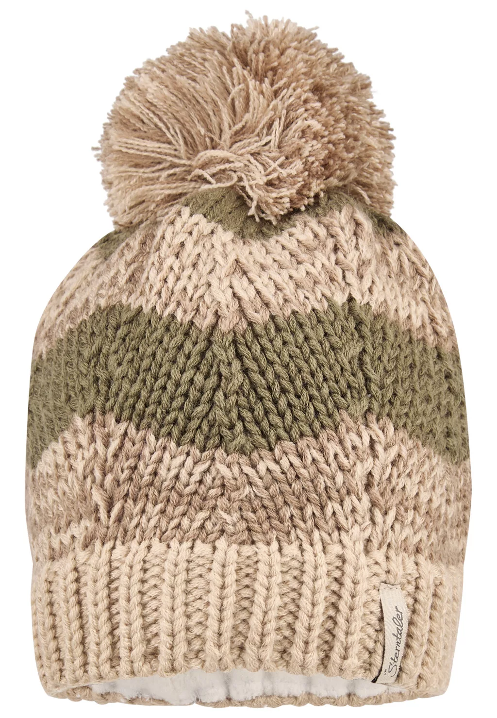 Csíkos, melange hatású, egyszínű pomponnal díszített finom kötésű téli sapka, melynek bélése organikus pamutból készült.